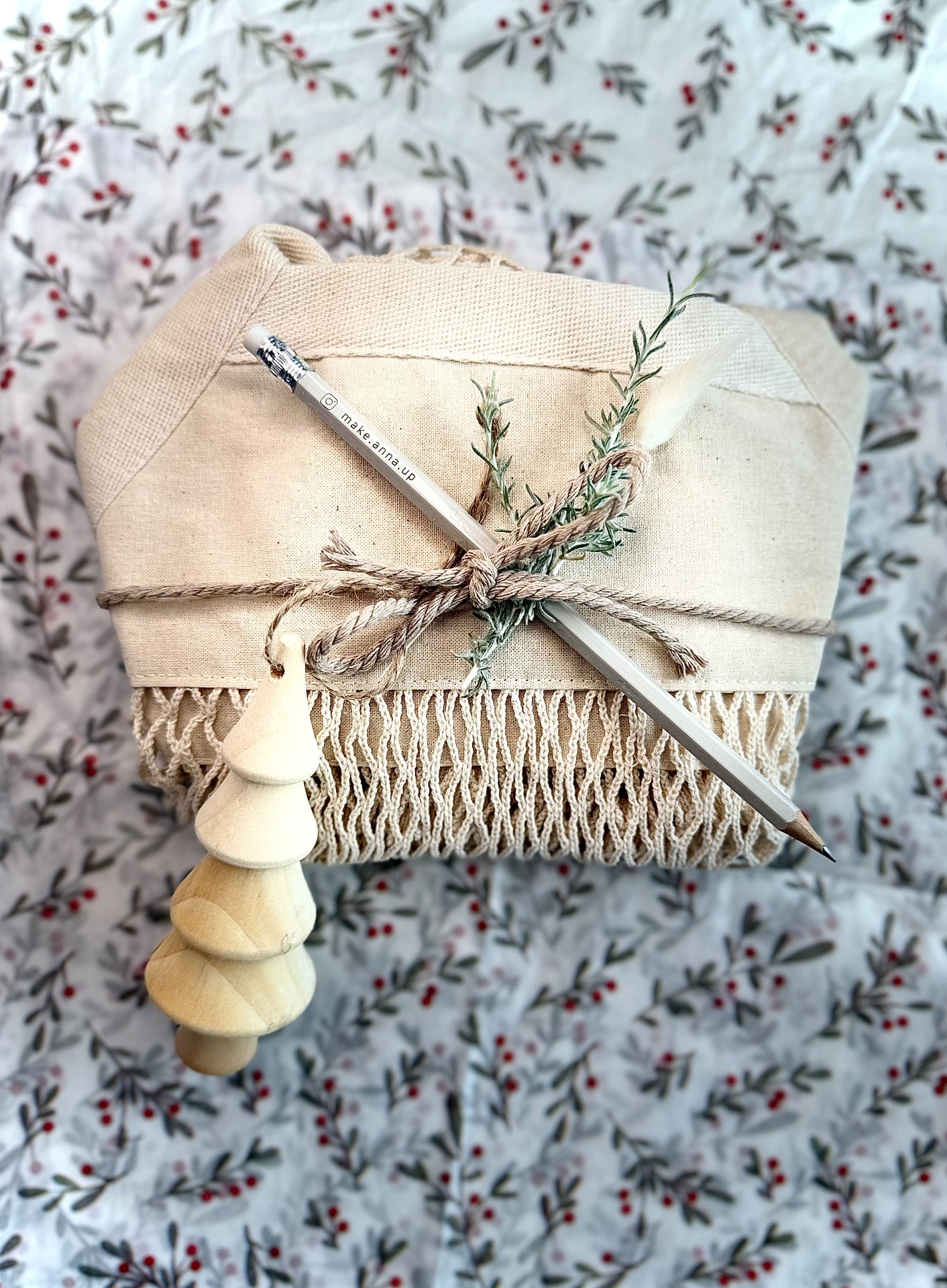 Balíček obsahuje síťovku, tužku a dřevěnou ozdobu ve tvaru stromečku, ideální pro kreativní a sváteční chvíle. Perfektní dárek, který zahřeje srdce i rozzáří Vánoce.